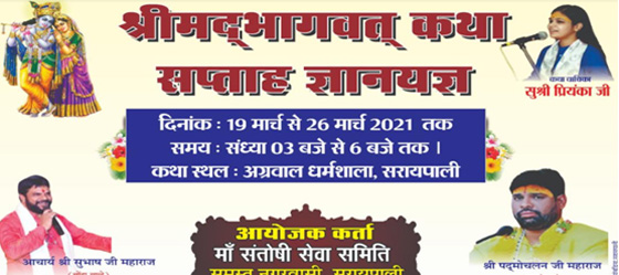 सरायपाली. स्थानीय अग्रवाल धर्मशाला में संगीतमय श्रीमद्भागवत कथा का आयोजन शुक्रवार 19 मार्च से 26 मार्च तक समय दोपहर 3 बजे से शाम 7 बजे तक आयोजित है. उक्त भागवत कथा सुश्री प्रियंका बालविदुषी सुपुत्री आचार्य सुभाष महाराज बोंदा वाले एव पदमलोचन महाराज के ओजमयी सुमधुर वाणी से श्रवण करने का नगरवासियों को सौभाग्य प्राप्त हो रहा है. उक्त कार्यक्रम की रूपरेखा के अनुसार शुक्रवार 19 मार्च को श्रीमद् भागवत अमृत कथा, शनिवार 20 मार्च को शिव विवाह, रविवार 21 मार्च को ध्रुव प्रहलाद चरित्र,