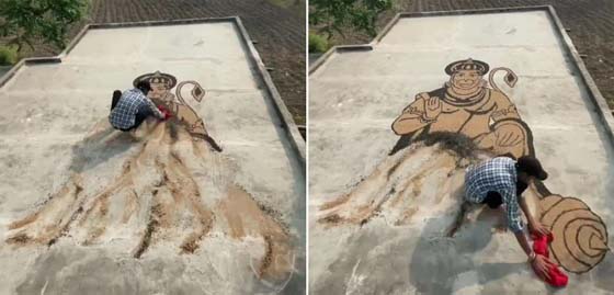 नई दिल्ली. सोशल मीडिया में एक वीडियो वायरल हो रहा है. इस वीडियो में शख्स की आर्ट देखकर आप भी तारीफों के पुल बांधते नजर आएंगे. इस वीडियो को ट्विटर पर शेयर किया गया है. इस वीडियो में एक शख्स को अपने घर की छत पर ढेर सारी मिट्टी बिखेरते हुए देखा जा सकता है. पहले कुछ सेकंड में ये पता लगाना काफी मुश्किल है कि आखिर आर्टिस्ट क्या बनाना चाहता है. लेकिन धीरे-धीरे उसकी कला निखरकर सामने आती है. धीरे-धीरे ये मिट्टी की कलाकारी भगवान हनुमान की तरह दिखने लगती है.